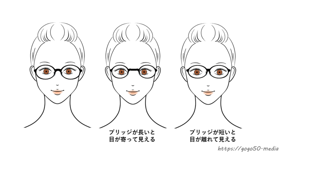 ブリッジが長すぎると目が寄って見えるし、短いと目が離れて見えるので、まずは、自分の顔(目の位置)にぴったりのレンズ幅とブリッジの長さを知っておきましょう。