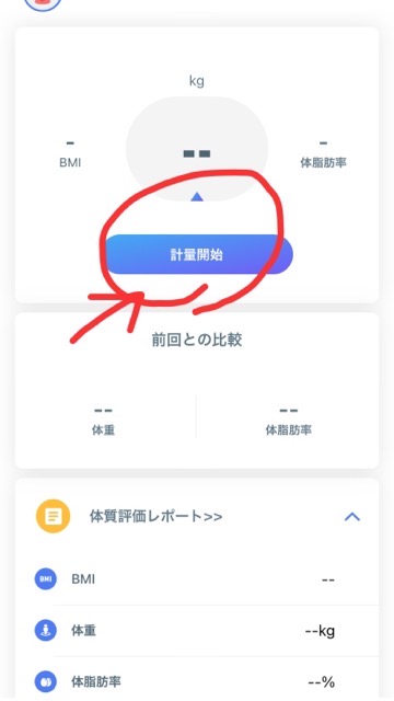 早速計測開始を押します。(この時点では、まだ体重計に乗らなくて大丈夫です)