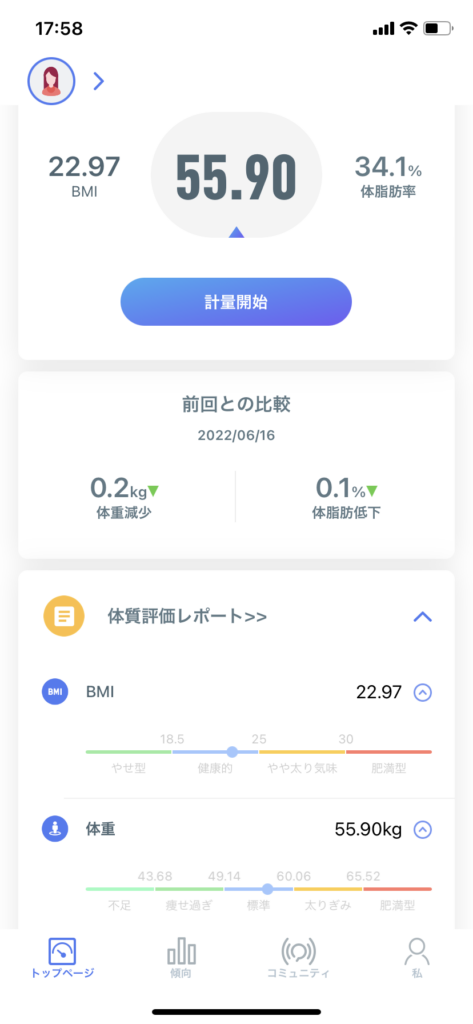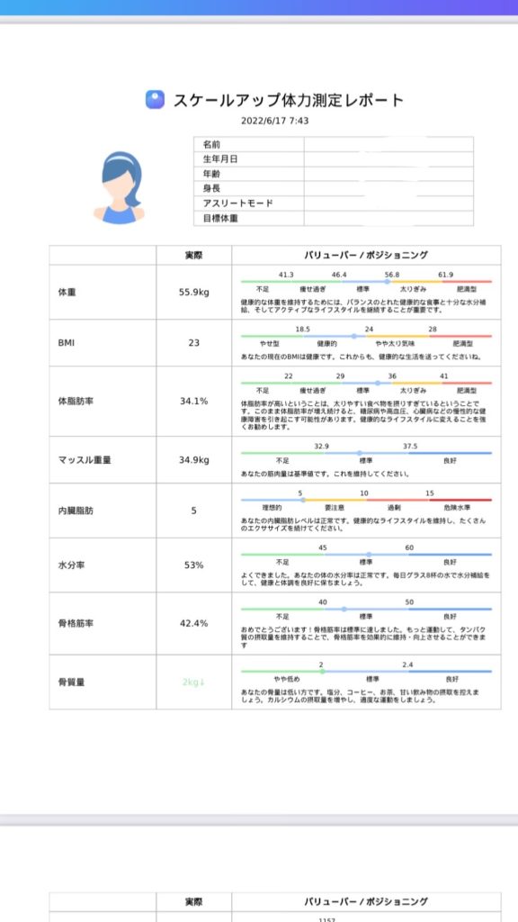 体重だけでなく、体脂肪率や基礎代謝も出てくるので、食事の管理にも役に立ちそうです。