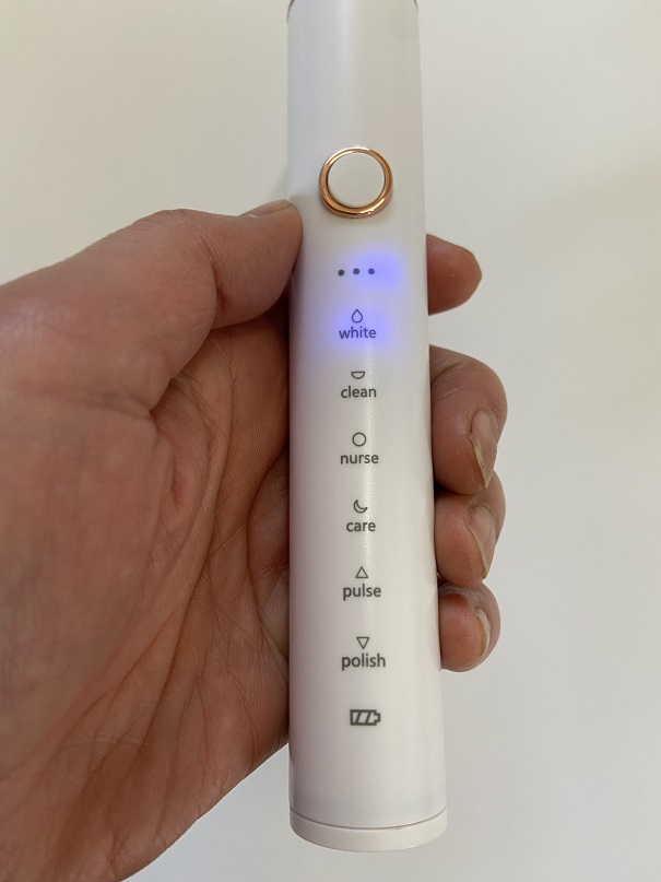 電源ボタンを何度か押すと、モードが変えられるんですが、私は、磨きモードが気に入ったので、磨きモードで使っています。次に電源を入れた時は、前に使っていたモードから使えるので、毎回設定しなくてもいいのもいいですね。