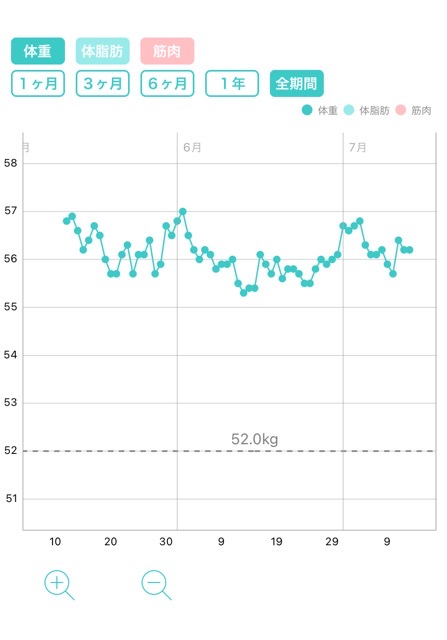 見せるのもお恥ずかしいレベルで、ほんの少し痩せたかな・・というレベルですが、毎日の食事と体重を記録して、なんとかモチベーションを保っています。